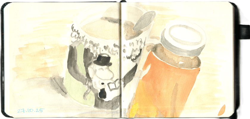 It’s scary to just start painting with only a minimum of sketching, an express portrait of the tea on my desk. This attempt is in watercolour and shows the Finnish all-pervasive classic, the Moomin mug, and my jar of honey.