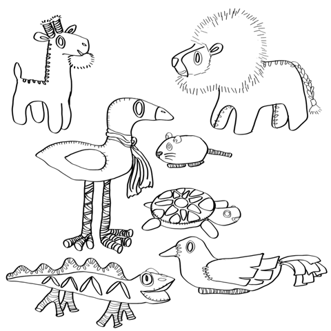 These felt souvenirs, made in neighbouring Chamula, are a ubiquitous sight here in San Cristóbal de las Casas. I find them very cute and endearing, even though they aren’t exactly cuddly. I prefer the ones made from rough woollen felt rather than the bright synthetic felt you see more and more. The animals sometimes have bright red rings around their eyes, giving them a hungover or even deranged look. As part of the great Sancris colour anarchy, you can colour these in any (and I mean ANY) combinations you like, each panel a different hue, and remain totally true to the original style. I wanted to include these animals in my Sancris colouring book – I originally got the idea of the colouring book when I started notcing the subtle differences in the Sancris felt giraffes, and thought that it would be fun to be able to colour them to my liking.