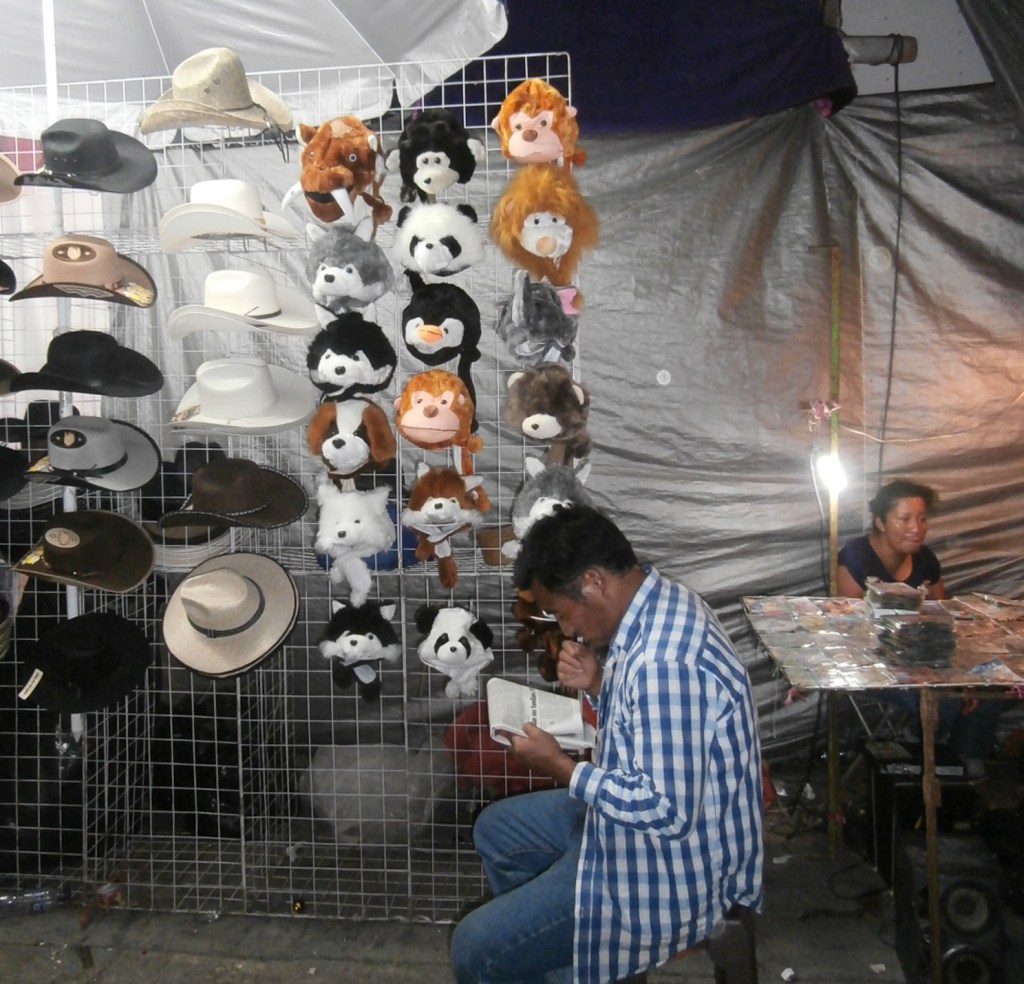A Mexican street scene: one of the guys selling toasted snacks, peanuts and grasshoppers (chapulines) with lemon and hot sauce. (In addition to people selling macadamia nuts, creamy pastries, shoeshine services, oranges whole, peeled or juiced, cotton candy etc… and I haven’t even mentioned the textiles or child labour)