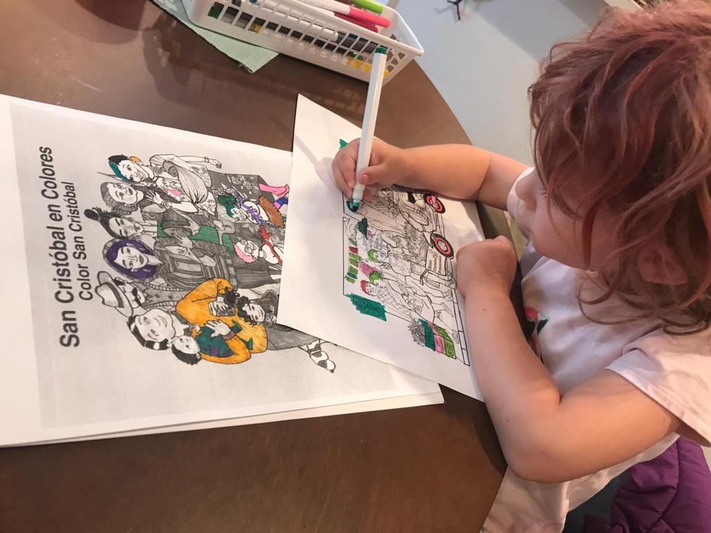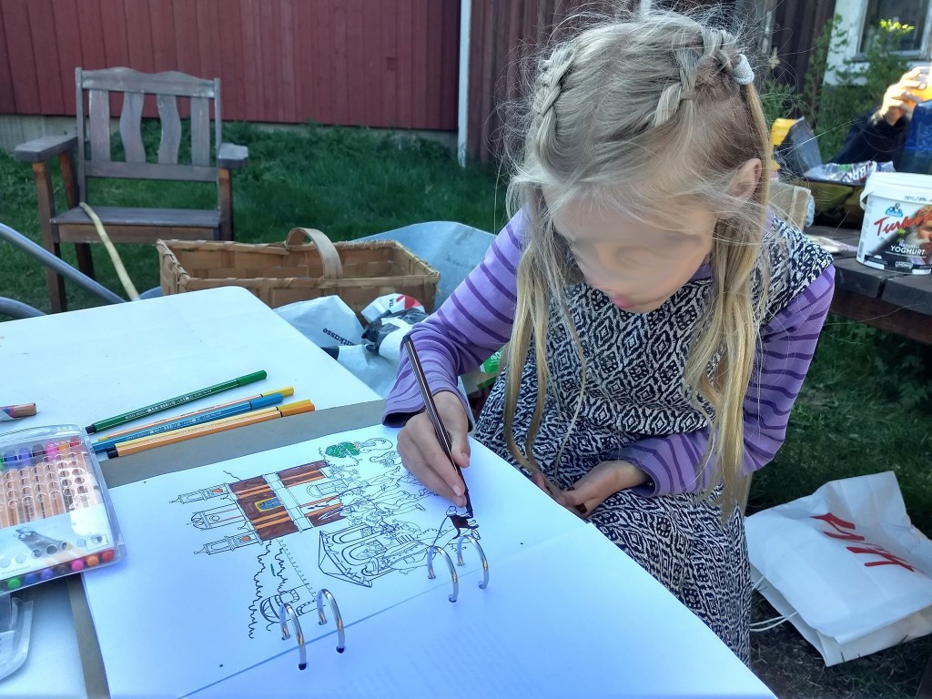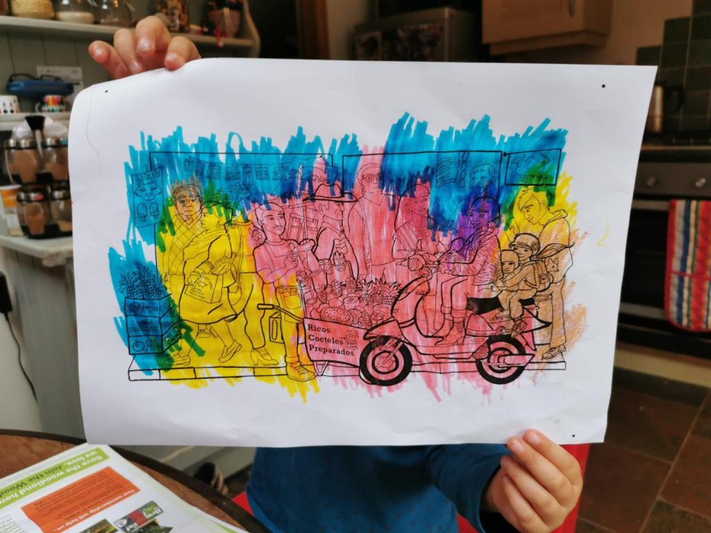 Children typically throw themselves at the colouring book – I’m not exaggerating, it’s surprised and delighted me each time. In the case of Luana, age 4, nobody had colouring pens to hand when she received hers… but luckily my partner had a pencil and with this she started happily colouring the merry-go-round picture grey.