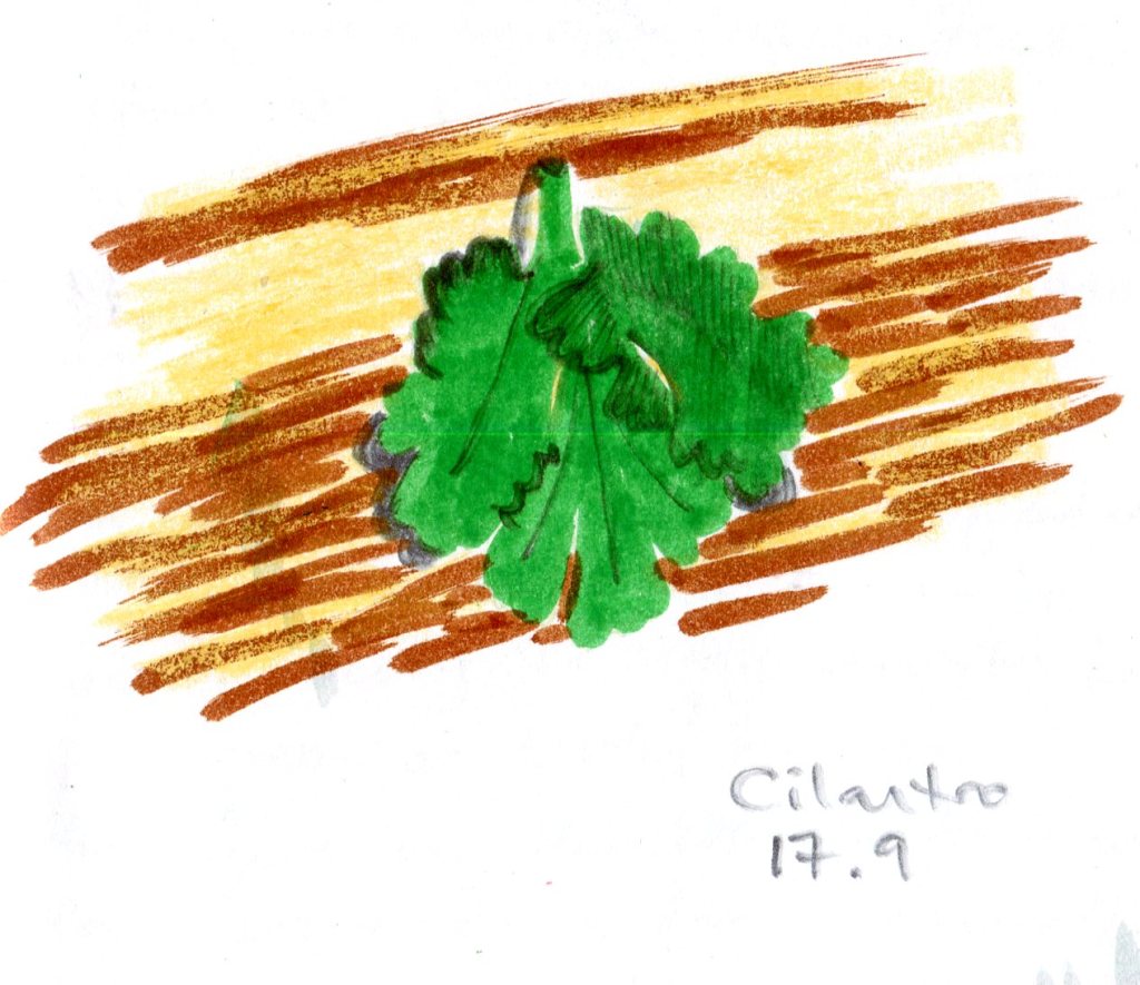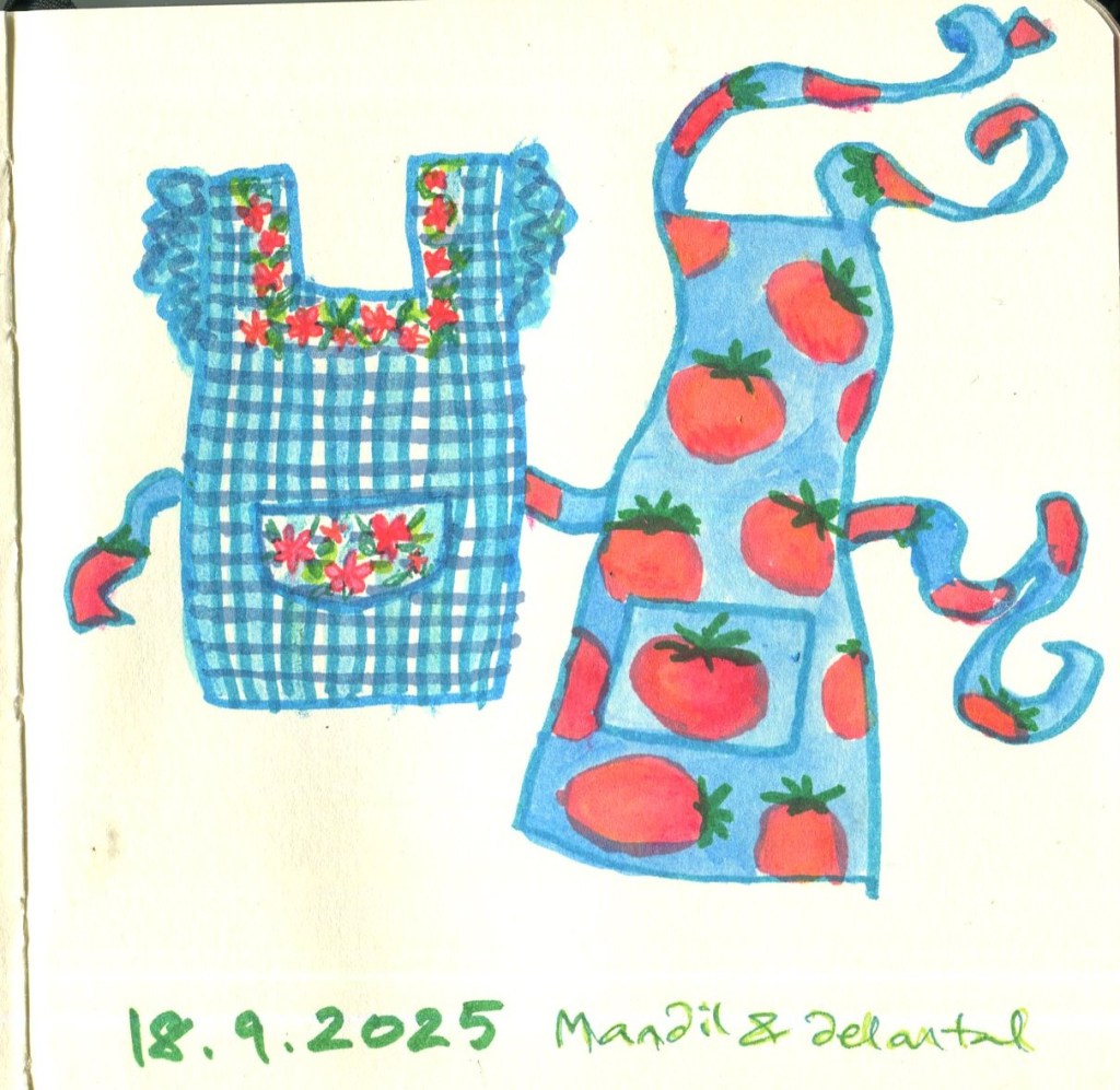 We have two kinds of apron, the smocks housewives wear and the fancier aprons for European-influenced cooks… and trying to draw a coriander leaf with children’s markers and crayons.