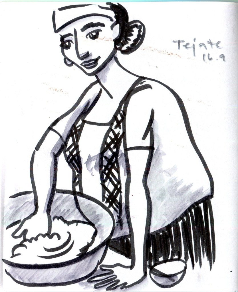In September I started sketching food, just something fun with the materials I had to hand. I found myself in Oaxaca state, watching the creamy cocoa fat and mamey-seed drink tejate being made. It’s served in painted half gourds, with ice.