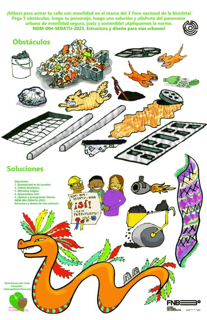 The idea is to start with the background sheet, add at least five hazards, your cyclist, and a solution! The best one (better than waiting for jetpacks to come to market) is getting decisionmakers to implement and cost national rule NOM-004-SEDATU-2023 on accessible urban design!
