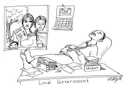 Monitoring and evaluation, or M&E, is a simple concept (working out whether you’re going according to plan, and whether your work is having an effect) that tends to become more complicated the more we try to simplify it. I spiced up INTRAC’s book “Rethinking Monitoring and Evaluation” with some irreverent illustrations in nib and ink. In this case it helped that I was also editing the book – familiarity with the messages makes it easier to come up with striking illustrations.
