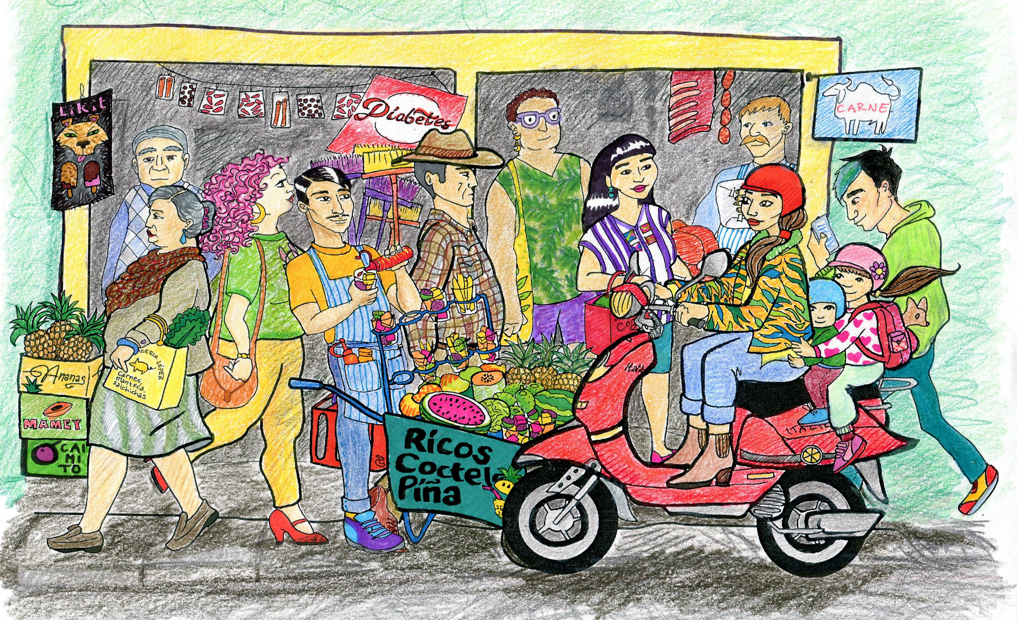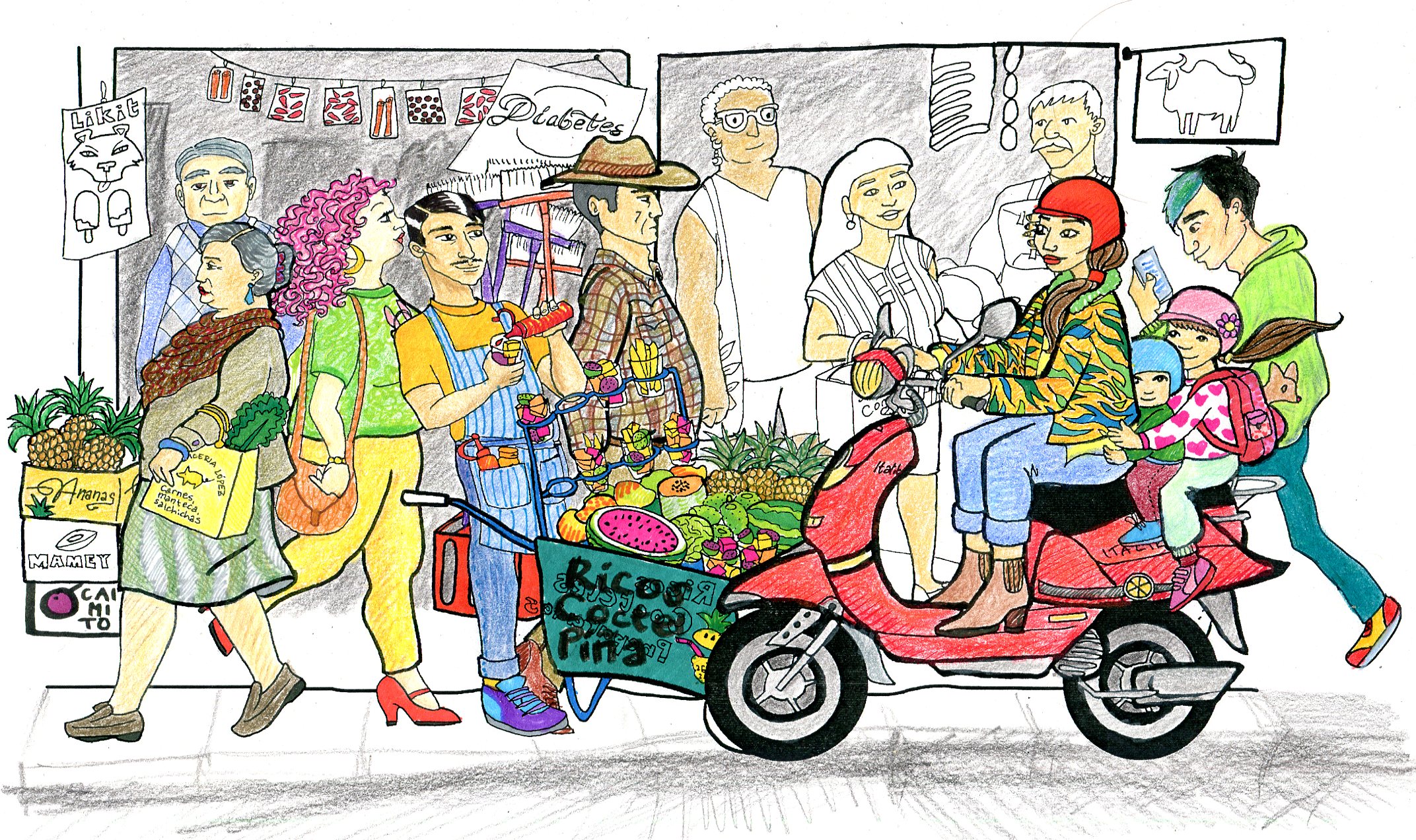 - A street scene featuring a fruit hawker, a whole family on a vespa, and passersby in front of a corner shop and a butcher’s.